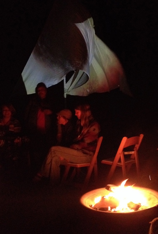 Outside by the fire, with projections of deep space imagery on the “sails” moving in the breeze
